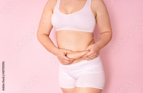 a fat girl holding a hand with excess fat on her stomach on a pink background. the concept of a woman's lifestyle with a diet to reduce the belly. recovery after childbirth. place for text