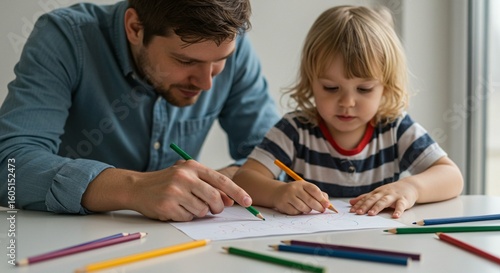 A father and his child are drawing on a white table with coloring pencils in a bright, naturally lit room.