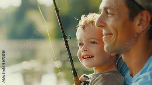 A father and son enjoying a peaceful moment while fishing together by a lake.