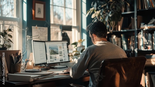A father at his home office desk, multitasking between work and spending time with his kids.