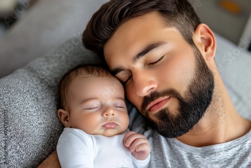 A father taking a nap with his newborn on his chest, both of them deeply relaxed in a peaceful living room