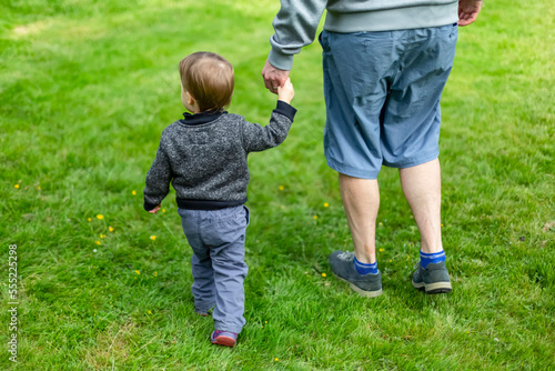 A father walks with his young daughter on grass, holding hands; North Vancouver, British Columbia, Canada