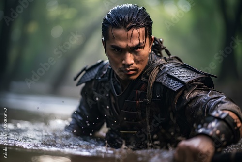a fearless oriental warrior, showcasing his powerful stance and weapon. generative AI