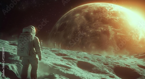 A fearless team traverses the barren expanse of the moon, surrounded by the vastness of space and the otherworldly beauty of this celestial body