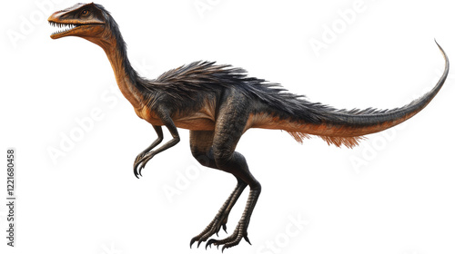 A feathered dinosaur: A detailed illustration of a fearsome dinosaur with a long neck, sharp claws and feathers, a fascinating look into prehistoric life.