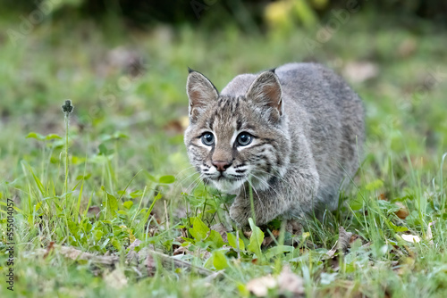 A feline, bobcat, stalking and sneaking through grass. Short grass and plants cover the cat.