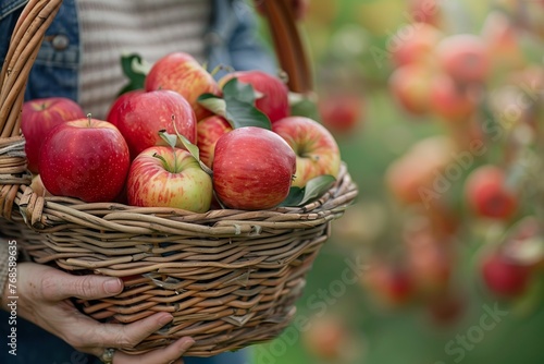 A female bring basket filled to the brim with freshly picked apples, showcasing the bounty of the harvest season.