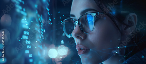 A female business professional with glasses examines data on a digital screen in a double exposure effect. The close-up shot features a futuristic office background with macro details and soft blue li