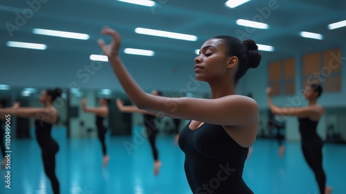 A female dancer in black attire elegantly extends her arms in an atmospheric dance studio, embodying precision and expression amid fellow dancers.