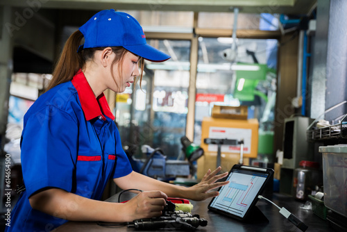 A female diesel engine mechanic in a blue uniform is working at the garage. Inspect and maintain the fuel pressure booster pump system and common rail injectors.