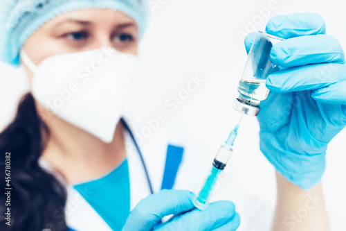 A female doctor in a medical face mask and gloves dials the vaccine into a syringe from an ampoule. Medical worker close-up. Vaccination against infectious and colds.