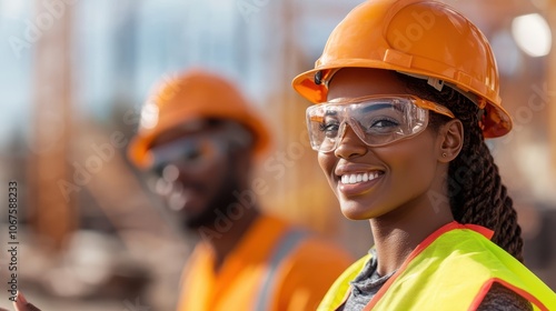 A female engineer smiling while in a safety vest and helmet, representing optimism and professionalism in a dynamic construction environment with bustling activity.