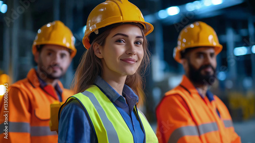 A female engineer wearing a yellow hard hat and a reflective vest stands next to two coworkers wearing orange safety vests.