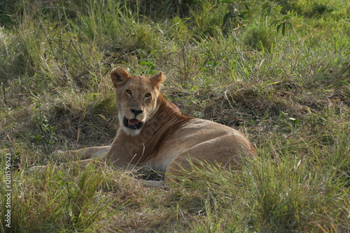 A female lion rests gracefully on the vast savanna of Maasai Mara, Kenya, exuding a sense of calm and quiet strength.