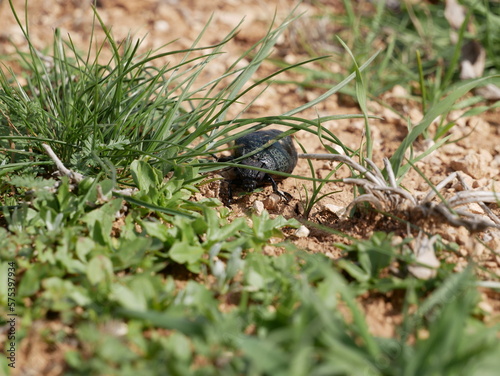 A female of a large black beetle without wings on a sunny spring day. A poisonous beetle with a soft belly on stony soil among green grass. Meloe proscarabaeus in its natural environment.