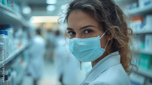 A female pharmacist in a protective mask stands in a pharmacy aisle, ready to assist customers. Shelves filled with various medicines are visible, showcasing her dedication to health and safety
