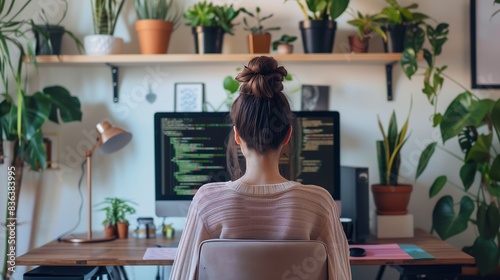 A female programmer codes intently in a minimalistic, organized home office adorned with plants and art.