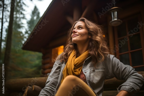A female tourist enjoying the peaceful lakeside scenery, with a cabin and mountains in the background