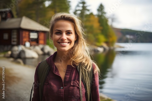 A female tourist enjoying the peaceful lakeside scenery, with a cabin and mountains in the background