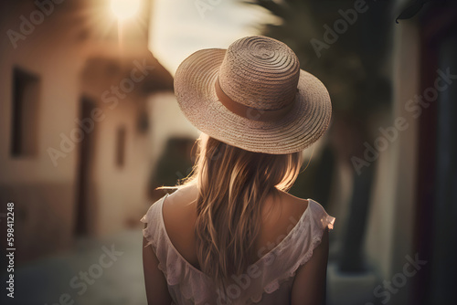 A female tourist walks along the ancient streets, Generative AI
