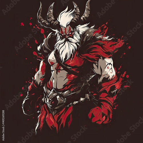 A ferocious, demonic santa figure with horns, a long beard, and bloody attire.