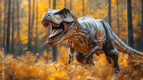A ferocious dinosaur roaring in a vibrant autumn forest filled with golden foliage