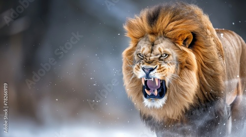 a ferocious roaring lion, its mane standing on end as it asserts its dominance, a scene that embodies the untamed power and inherent danger that lies within the heart of the king of beasts