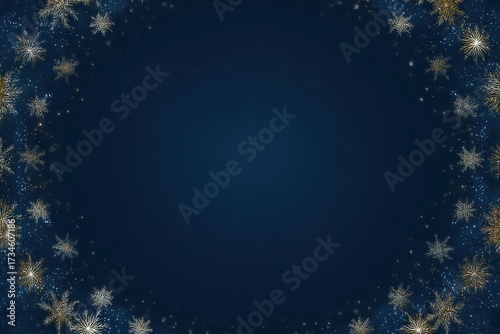 A festive and elegant dark blue gradient background adorned with shimmering gold stars and delicate snowflakes, perfect for Christmas promotions and discounts.