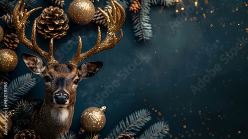 A festive arrangement featuring a deer head, pinecones, and golden ornaments against a dark backdrop.