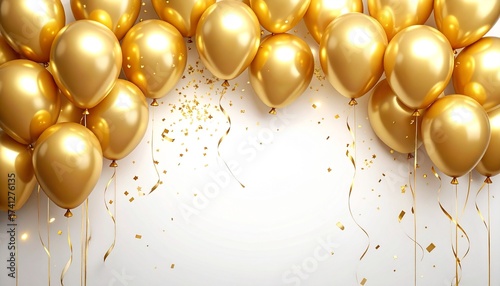 A festive arrangement of golden balloons with confetti and ribbons against a bright white background.