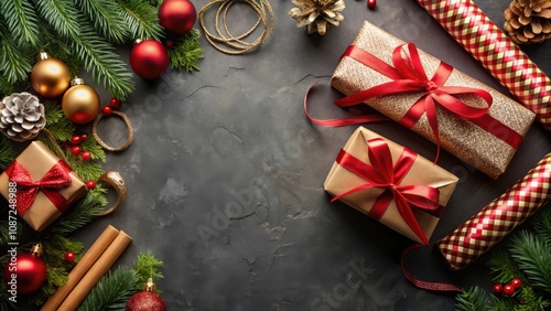 A festive background with Christmas gifts, ornaments, and greenery, perfect for holiday greetings or seasonal promotions.