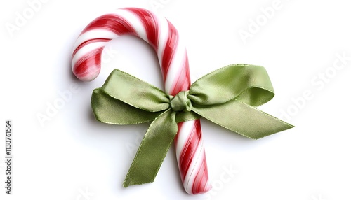 A festive candy cane tied with a green ribbon, symbolizing holiday cheer.