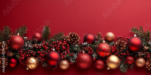 A festive Christmas garland adorned with red and gold ornaments, complemented by natural pine cones, perfect for holiday decoration.