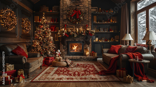 A festive Christmas living room with a decorated tree, presents, and a cozy fireplace