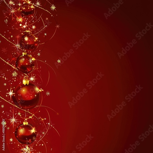 A festive Christmas scene featuring a bright red background with golden stars and ornaments