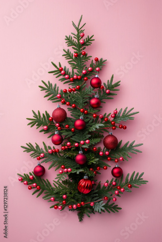 A festive Christmas tree arrangement made of pine branches and decorated with red ornaments on a pastel pink background. A creative holiday decoration concept.
