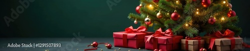 A festive Christmas tree with wrapped presents, ribbons, wrapped