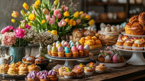 A festive Easter breakfast spread in a cafe with a variety digital pic