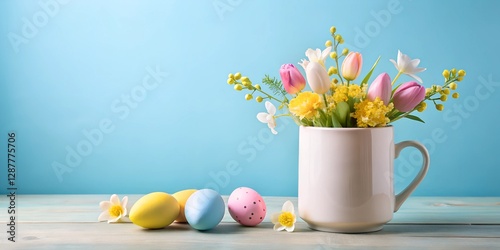 A festive Easter mockup featuring a white ceramic mug filled with fresh spring flowers, placed on a wooden surface with colorful eggs. A beautiful design for seasonal branding, invitations