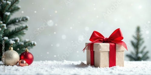 A Festive Gift Box Adorned with a Crimson Bow Rests on a Snowy Surface Near a Decorated Evergreen Tree, Evoking the Spirit of Winter Celebrations