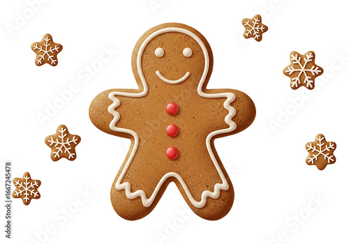 A festive gingerbread man cookie, adorned with white icing and red candies, sits against a striking black background, complete with decorative snowflakes.