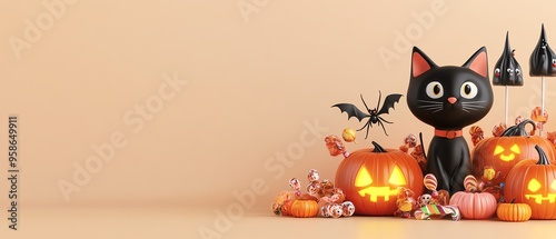 A festive Halloween scene with a black cat, pumpkins, bats, and candies, perfect for spooky celebrations and decorations.