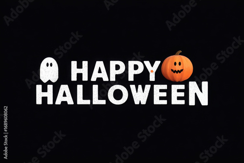 A festive Happy Halloween greeting with a ghost and a smiling jack-o'-lantern on a simple black background.