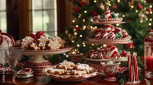 A festive holiday table with a rich display of gingerbread cookies, candy canes, and a beautifully decorated Christmas tree in the background