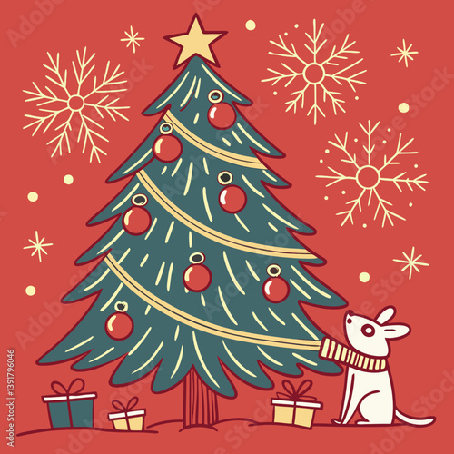 A festive illustration featuring a magical Christmas tree surrounded by snowflakes on a vibrant red background, perfect for holiday-themed designs.