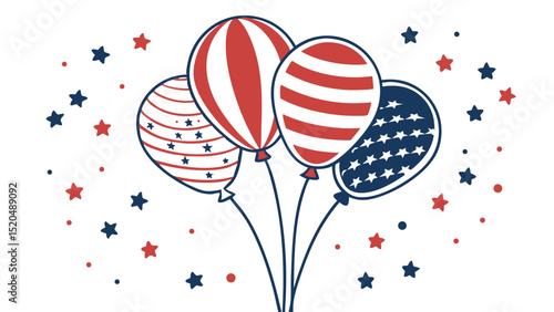 A festive illustration of patriotic balloons with stars in red white and blue colors on white ground