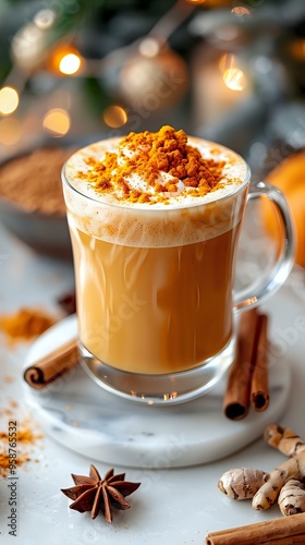 A festive image of a creamy spiced latte topped with whipped cream and cinnamon, surrounded by holiday spices like star anise, cinnamon sticks, and nutmeg. Perfect for seasonal, food, and cozy winter