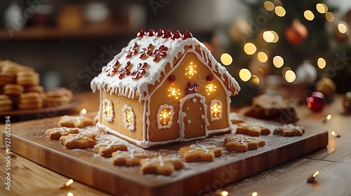 A festive kitchen with a freshly baked gingerbread house and Christmas cookies on the counter