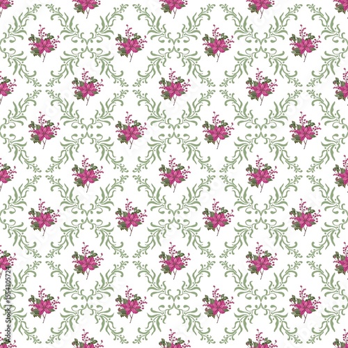 A festive pattern featuring clusters of red poinsettias and berries with green leaves, set against a subtle, light background with a delicate green ornamental leaves Perfect for holiday cheer.
