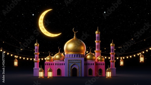 A festive Ramadan illustration featuring a colorful mosque and crescent moon.